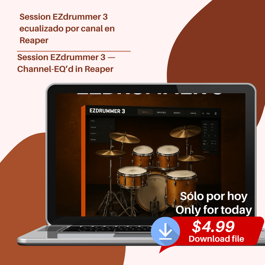 Upon purchase, you’ll receive: 1 REAPER template file (.RPP) fully configured for EZdrummer 3. Multichannel routing enabled and organized track by track. Professional EQ applied on every channel. / Al realizar la compra, obtendrás: 1 archivo de plantilla para REAPER (.RPP) totalmente configurado para EZdrummer 3. Ruteo multicanal activado y organizado pista por pista. Ecualización profesional aplicada en cada canal.
